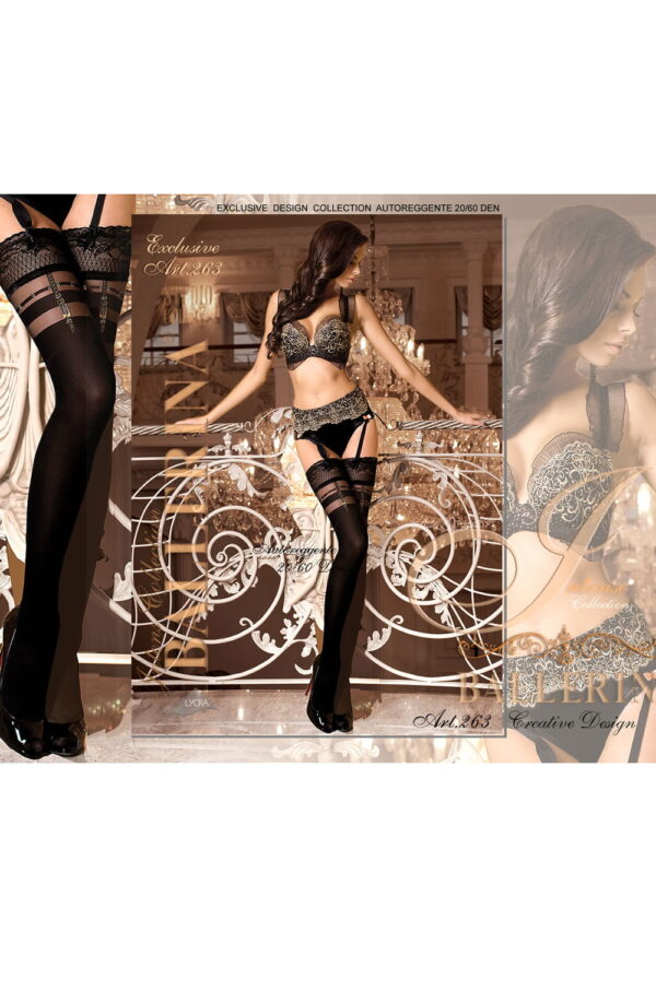 Stunning black hold ups with unique faux suspender design. Sparkly detailing using delicate metallic Lurex threading. All items come in branded Ballerina packaging.