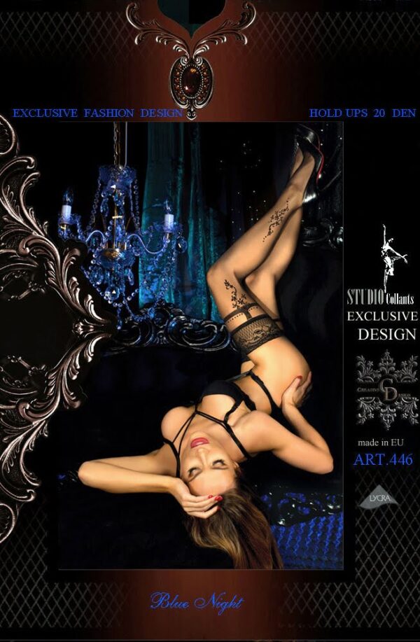 Introducing the sensational new collection by Ballerina ‘Blue Night’; including a mixture of 16 adventurous tights and hold ups. Taken to another level Ballerina have seductively photographed this range in a mysterious and magical environment with a beautiful chandelier seen in the background. Perfect hosiery for any occasion and if blue is your favourite colour you’re going to love this. A remarkable pair of hold ups in Nero (Black) with a gorgeous floral design on the leg. At the top of the hold ups is a bold black design wrapped around the thigh with elegant embroidered polka dots and a floral design. Another floral design features at the lower calf and these patterns are finished with Lurex thread producing the most sensational sparkle. 20 denier hold ups. An elegant lace trim band sits at the top of the hold ups and found within are two silicone strips on the inside. This product is presented in luxury embossed packaging with a picture insert.