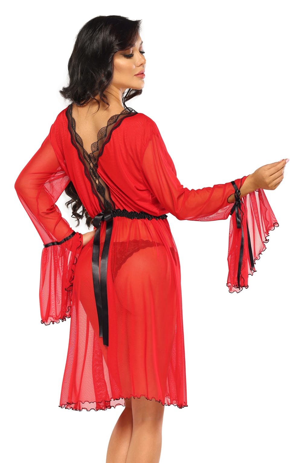 Unleash your inner goddess with the Valentina peignoir, a luxurious and sensual lace robe perfect for women who want to feel both alluring and elegant. Ideal for romantic evenings and special occasions, this stunning sheer peignoir combines delicate materials with sophisticated details, making it a must-have in your luxury lingerie collection. Key features: The flowing, sheer fabric of this sexy robe drapes beautifully over the body, creating a seductive yet elegant silhouette. The deep V-neckline and back are adorned with delicate black lace, adding a touch of sophistication and charm to this lace robe for women. Made from lightweight, breathable mesh, this lace lingerie robe feels incredibly soft on the skin, offering maximum comfort. Long, flowing bell sleeves with frilled edges and ribbon accents add a whimsical, romantic touch to the overall design. Includes matching thong panties, perfectly complementing the robe for a coordinated look. The Valentina peignoir comes in elegant packaging with a product photo, making it an ideal gift for a loved one or a luxurious treat for yourself. Don’t miss the chance to elevate your sexy lingerie collection with the Valentina lace peignoir. Feel like a true queen every time you wear it, whether for a romantic night in or a special occasion!