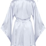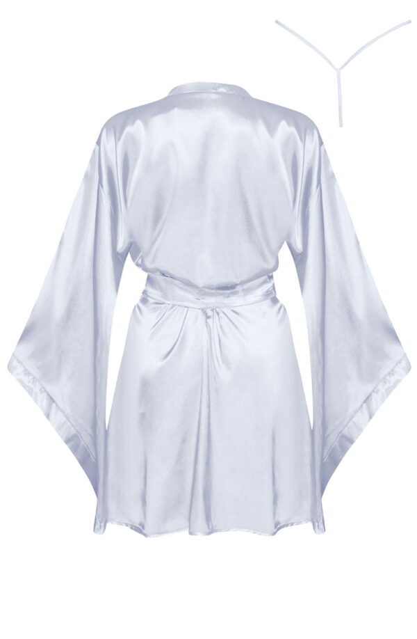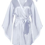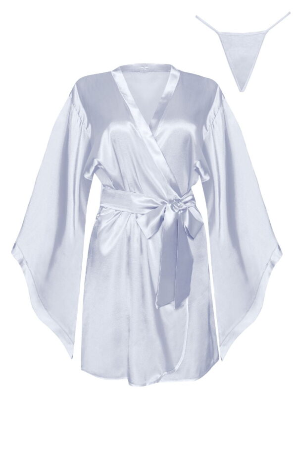 The sophisticated Samira peignoir in stunning silver embodies both luxury and comfort, ideal for romantic evenings or relaxing at home. Key features: Crafted from smooth, shiny fabric that gently hugs the body Wide, airy sleeves for a touch of lightness and elegance Waist belt to accentuate the silhouette Comes with a matching thong and belt A perfect gift for a loved one or a treat for yourself Elegantly packaged with an image showcasing the product.