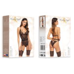 Indulge in this sultry set made of delicate lace and semi-transparent mesh. Featuring garter straps, a hook closure, and adjustable straps for the perfect fit. The cups are none wired and crafted from black lace with copper accents, beautifully enhancing the neckline, while the matching brief completes the look. Elegantly packaged with a captivating photo of the set. Please note the stocking are not included but are available separately.
