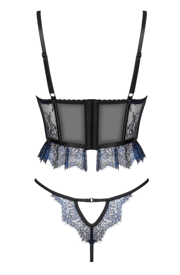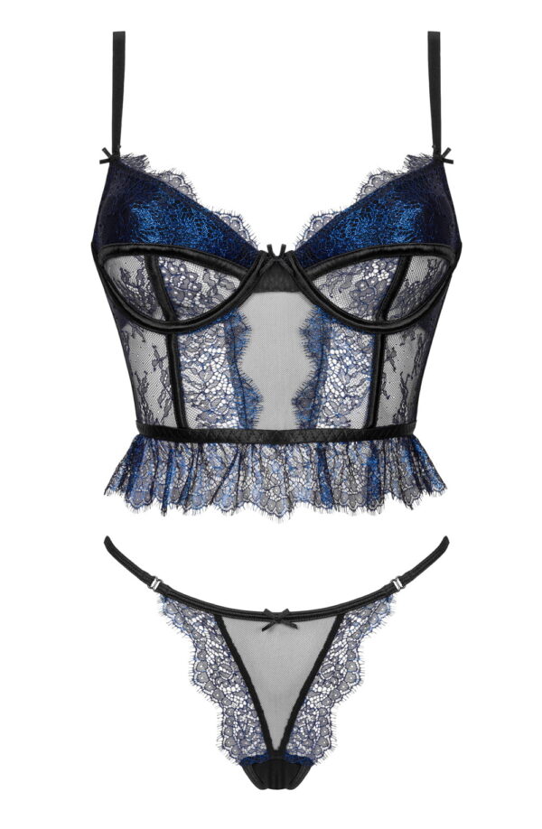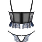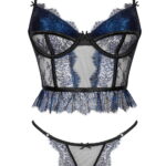 Indulge in this exclusive, romantic lingerie set featuring a short corset and matching panties. Crafted from black tulle and metallic sapphire lace, this set exudes sophistication and allure. The corset includes boning in and below the cups, adjustable straps, and a hook closure for a secure and flattering fit. The delicate panties perfectly complete the ensemble. Elegantly packaged with a photo showcasing the product, this set is ideal for gifting or personal indulgence.