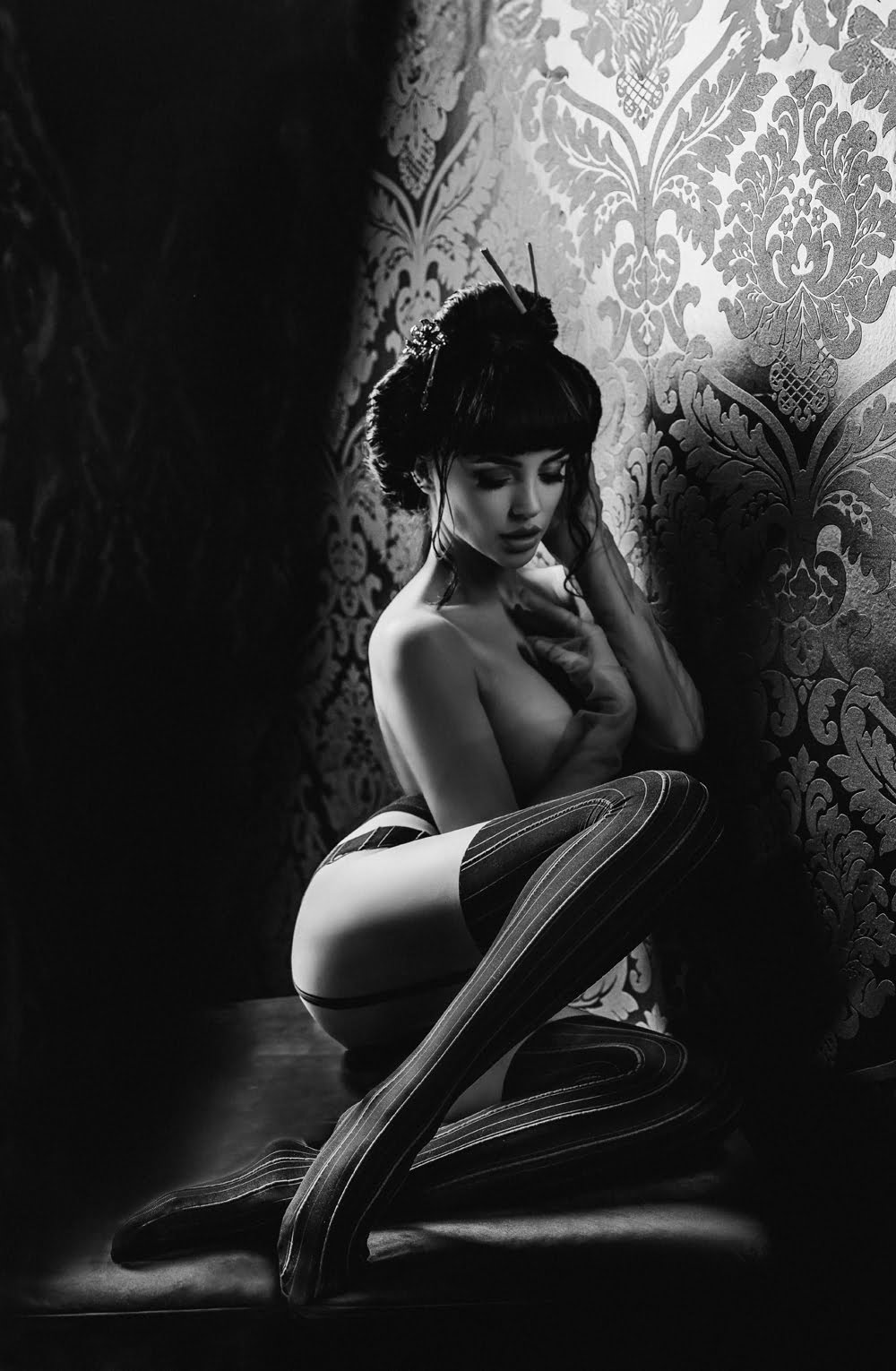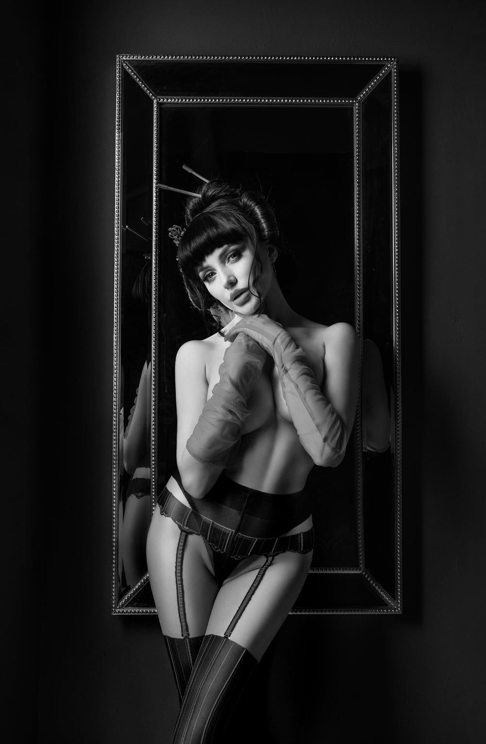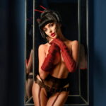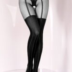Introducing our Black Crotchless Tights with Bordeaux Pin Striping, Faux Suspender Belt, and Brief –Adorned with a faux suspender belt and brief detailing, they offer a daring yet sophisticated look. Perfect for adding a touch of glamour to any outfit or intimate occasion. Packaged in our sleek black Secret branding, they’re ready to elevate your style with unmatched sophistication and charm!