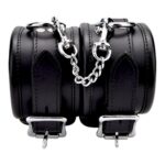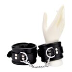 Soft and padded for comfort and safety but sturdy for advanced and lengthy bondage play, these cuffs will leave you really Bound. Establish a tone of exquisite pleasure and pain by restraining your partner with these exclusively high quality, durable nubuck leather wrist cuffs. Comes with a detachable double trigger hook chain connecting the D-rings on each cuff, further restricting your partner’s movement if desired. Treat your sub to these high quality bondage cuffs, they’ll beg to be tied up just to feel the luxurious leather tight around their wrists, smell the genuine, high quality leather and enjoy the inescapability of these premium physical restraints. Features: