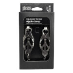 When clipped to nipples, the these Squeezer Teaser clamps tighten as the chain is pulled, putting the wearer at the mercy of the pull of a chord. Connected by a silver chain, the metal links also add sensory arousal when against skin.