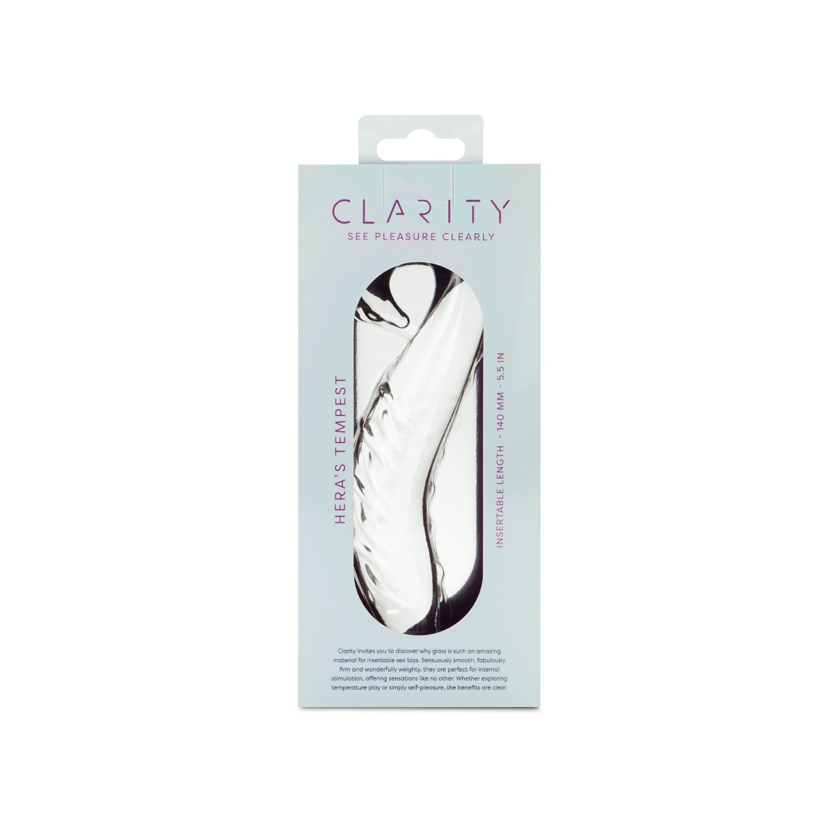 Hera’s Tempest is a 5.5-inch glass dildo with a sculptural circular handle blending graceful design with precise controlled pleasure.