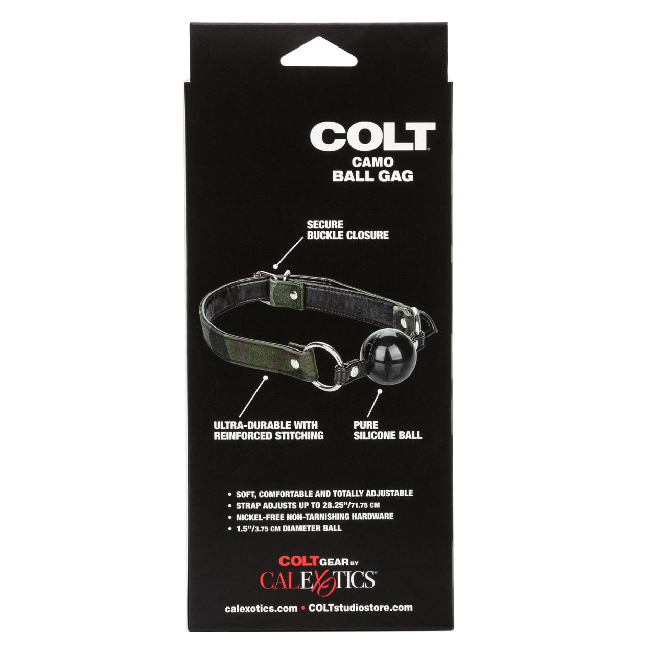 Give yourself over to passion with the masculine Colt® Camo Ball Gag; Bask in primal moans and elevate pleasure with the pliable silicone ball gag padded vegan leather interior and heavy duty camo canvas.