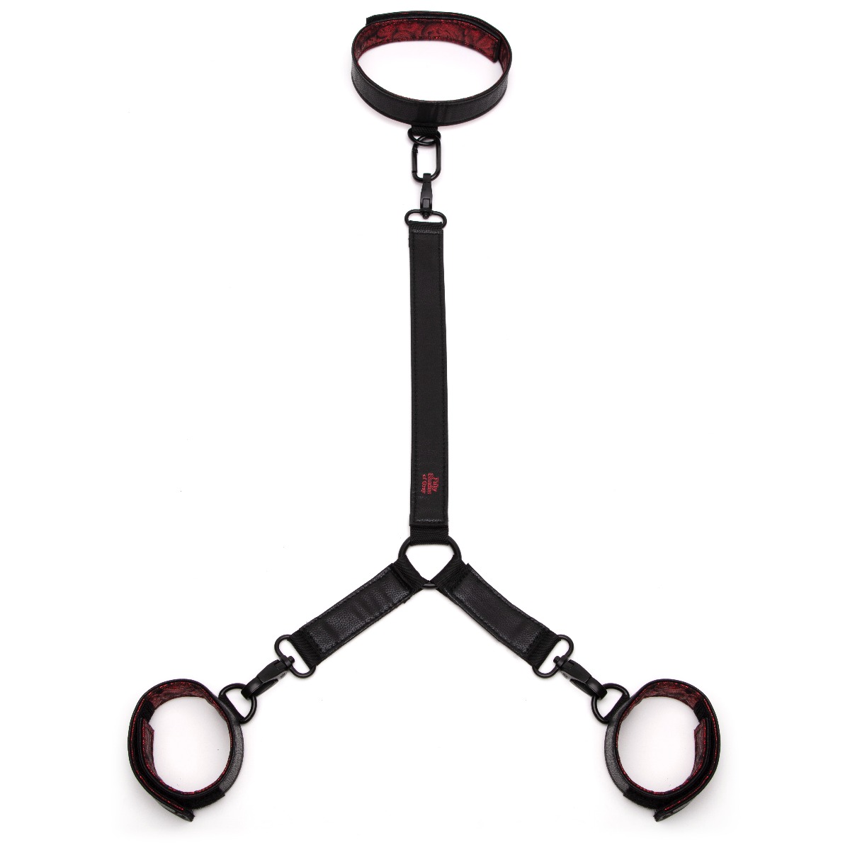 Achieve the perfect fit to keep your sub restrained and under control with the Fifty Shades of Grey Sweet Anticipation Reversible Faux Leather Collar and Wrist Restraints. Quick-release chain connectors and D-rings on the cuffs and collar enable a variety of restraint positions while the thick padding ensures for a comfortable fit.