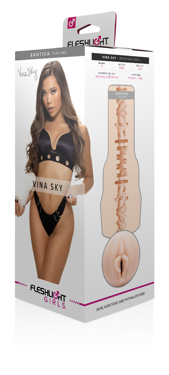 Let the warm tight-gripping contours of incredibly soft real feel super skin enclose your penis with this Exotica sleeve from Fleshlight that offers you a divine replica of Vina Sky’s moan-inducing vagina.