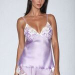 A charming and original short set made of the highest quality satin combined with a beautiful lavender and cream lace in a floral pattern. The cups are decorated with this gorgeous lace. The edges of the shorts feature a lace panel to match in this lovely contrasting lace. Thin adjustable straps. Andromeda arrives packaged in a lovely Irall box making it ideal for a special gift or treat. Also available in other styles. The Andromeda collection comprises Nightdress Set or Dressing Gown making it ideal for mix and match. Please see the ‘related products tab’ for these further styles.