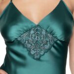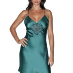 Very exclusive nightdress made of the highest quality satin. The front has a diamond shaped decorative lace panel. The back of the nightdress has an open back and deep V shaped embroidery in a floral pattern to match the front which is interspersed with a shiny lurex thread. Thin adjustable straps crossed at the back. Length above the knee with a height of 164 cm. This item arrives packaged in an Irall Box making it ideal as a gift or thread. There is also a matching dressing gown which is a available separately please see the ‘Related Product’ tab below for further information.