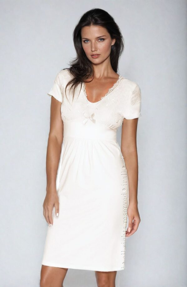 An elegant nightdress made of delicate viscose. The front and sleeves are decorated with a soft touch elastic lace. The bust is perfectly supported thanks to a special insert which further emphasizes its shape. The design of the nightdress perfectly covers up the imperfections of the figure. An additional charm is given by a satin bow on the front. The product is packed in an elegant box and a delicate tissue inside making it perfect as a gift or special treat. Knee-length at a height of 164 cm. Available in a choice of colours please see the ‘Related Products’ tab below for further details.