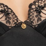 A unique and very elegant nightdress made of the highest quality satin. The upper part of the cups are finished with beautiful black embroidery with the effect of “tattoo”. Between the cups there is a golden ornament with a “zircon” inside. The back of the nightdress has an “open” back and is also finished with black embroidery with a tattoo effect. There are shoestring adjustable straps , crossing at the back.  Knee length with a height of 164 cm.  Mallory II nightdress arrives packaged in a lovely Irall box with tissue paper. Also available in Champagne colour, please see related products.