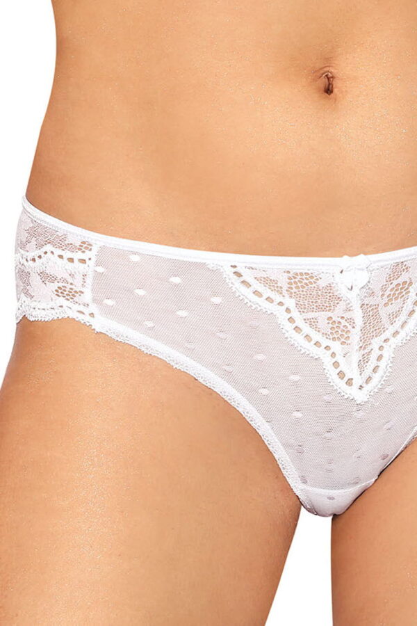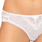 A beautiful brief with a pretty bow in the centre. The brief features a gorgeous lace V shape in the centre that carries through along the trim and back of the brief. A transparent mesh with subtle pretty polka dots has been used to decorate the front of the brief and gusset. This item arrives packaged in a lovely Roza box making it ideal as a gift or special treat. The Lagerta collection comprises of a push up bra, soft cup bra, thong or brief all available in black or white. Each piece is sold separately to maximise the mix and match options. Please see the ‘Related Products’ tab below to see other combinations.