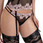 Introducing Nefer a classy and romantic design by Roza which includes a stunning push-up bra soft cup bra suspender belt brief and thong which are all available to order separately on the website. The suspender belt is an extremely romantic piece of kit which has various designing and support. At the front sits gorgeous salmon (rose) embroidery at the bottom of the suspender belt which contrasts delightfully with the black tulle mesh. The suspender belt itself is decorated with semi-transparent tulle mesh which is plain at the front however a velvet polka dot design skips its way around the back of the suspender belt. The top of the suspender belt has stretchy fabric to fit the waist. A very attractive oval shape bends at the back which gives the perfect amount of room to show off your matching thong or brief! Provided with this suspender belt is boning which can be found on the front and back in line with the suspender straps. The suspender straps are adjustable and the clasps are rubber with decorative ribboning sewn on top. In the middle of the suspender belt at the top sits a charming little black ribbon bow. At the back of the suspender belt is an adjustable hook and eye feature. Nefer arrives in her own Roza branded box with lovely tissue paper inside.