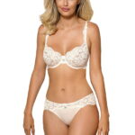 Newia is a lovely lacey collection from Roza offering a choice of four colours push up or soft cup bra options along with a delicate thong or brief. All items are available separately making them a ideal for mix or match options. The lacey ivory soft cup bra is decorated with a centre satin ribbon bow and diamante. The beautiful scalloped edges and decorated straps add to Newia’s feminine charms. Adjustable shoulder straps and hook and eye fastener at the back. This item arrives packaged in a lovely Roza box.