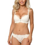 Newia Thong in ivory (shown in the picture with the push up bra option) is super soft with all over lace at the font and back (excluding gusset). The lace around the top is scalloped to match the push up or soft cup bra options. The thong has a lovey satin ribbon bow and diamante detail at the back. Brief bra and thong options are all sold separately available in four colours and arrive packaged in their own lovely Roza box.