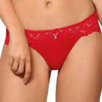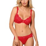 Newia Brief in red (shown in the picture with the soft cup bra option) is super soft with all over lace at the back. The front has lovely scalloped lace to match the push up or soft cup bra options. The brief has a lovey satin ribbon bow and diamante detail. Brief bra and thong options are all sold separately available in four colours and arrive packaged in their own lovely Roza box.