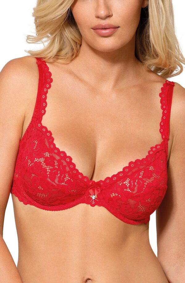 Newia is a lovely lacey collection from Roza offering a choice of four colours push up or soft cup bra options along with a delicate thong or brief. All items are available separately making them a ideal for mix or match options. The lacey red soft cup bra is decorated with a centre satin ribbon bow and diamante. The beautiful scalloped edges and decorated straps add to Newia’s feminine charms. Adjustable shoulder straps and hook and eye fastener at the back. This item arrives packaged in a lovely Roza box.