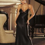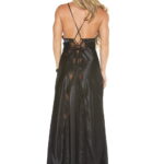 Stunning long gown with lace trimmed cups low back with criss cross tie shoulder straps that tie down to a flowing train of scalloped lace and charmeuse.