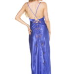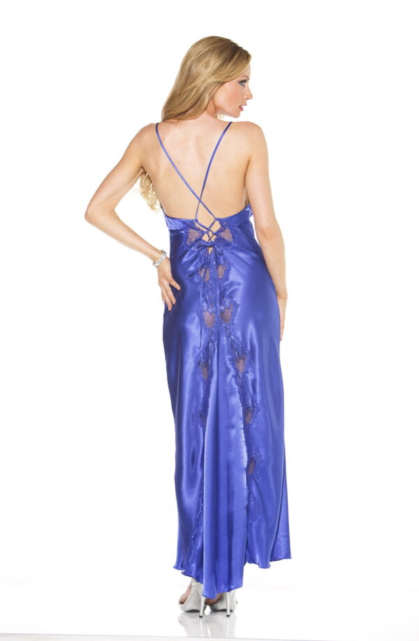 Stunning long gown with lace trimmed cups low back with criss cross tie shoulder straps that tie down to a flowing train of scalloped lace and charmeuse. Available in black electric blue red white. Also available in Plus Sizes.