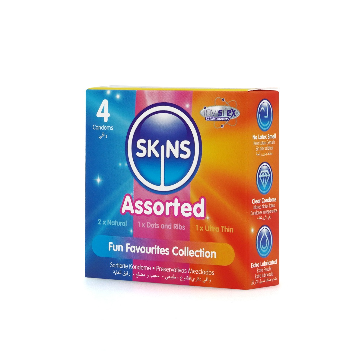 4 individual condoms in 3 exciting varieties each pack contains a mix of natural dots & ribs and ultra thin condoms allowing you to enjoy different pleasure adventures with this assorted pack of Skins favourites.