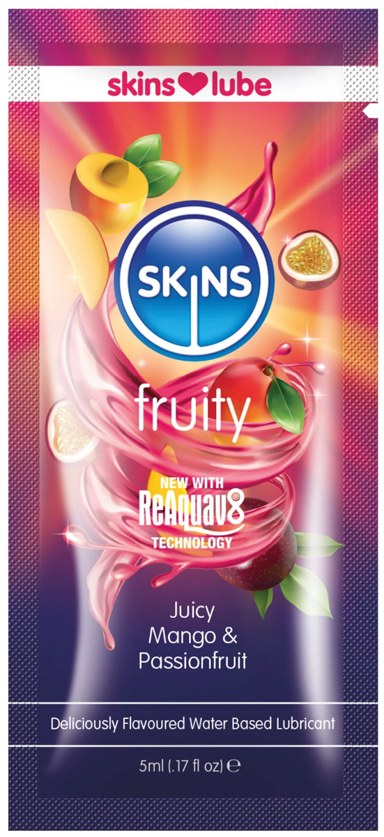 Juicy Mango & Passionfruit Flavoured Water Based Lubricant for fruity fun. An oasis of thirst-quenching delights Skins Fruity Lubes actually taste like real fruit and have none of the after taste that can be sometimes associated with flavoured lubes. Bursting with fruity goodness they come in three delicious flavours Sensual Strawberry Juicy Mango and Passionfruit and Refreshing Watermelon.