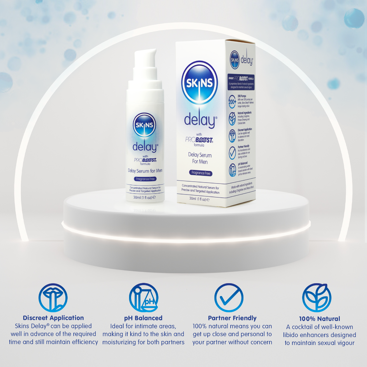 Skins Delay® is an award-winning proprietary blend of all-natural ingredients designed to maintain sexual vigour and improve endurance. Skins Delay® is made from a unique PROBOOST® formula with natural ingredients including L’Arginine Panax Ginseng Gingko Biloba Maca Root Saw Palmetto and Catuaba Bark.