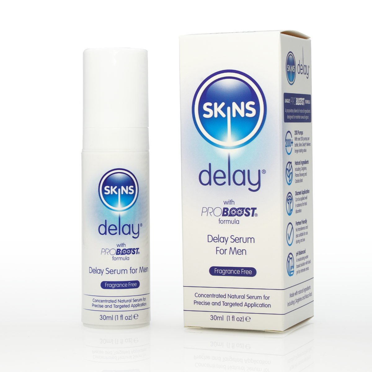 Skins Delay® is available as a spray serum or in a foil as below: