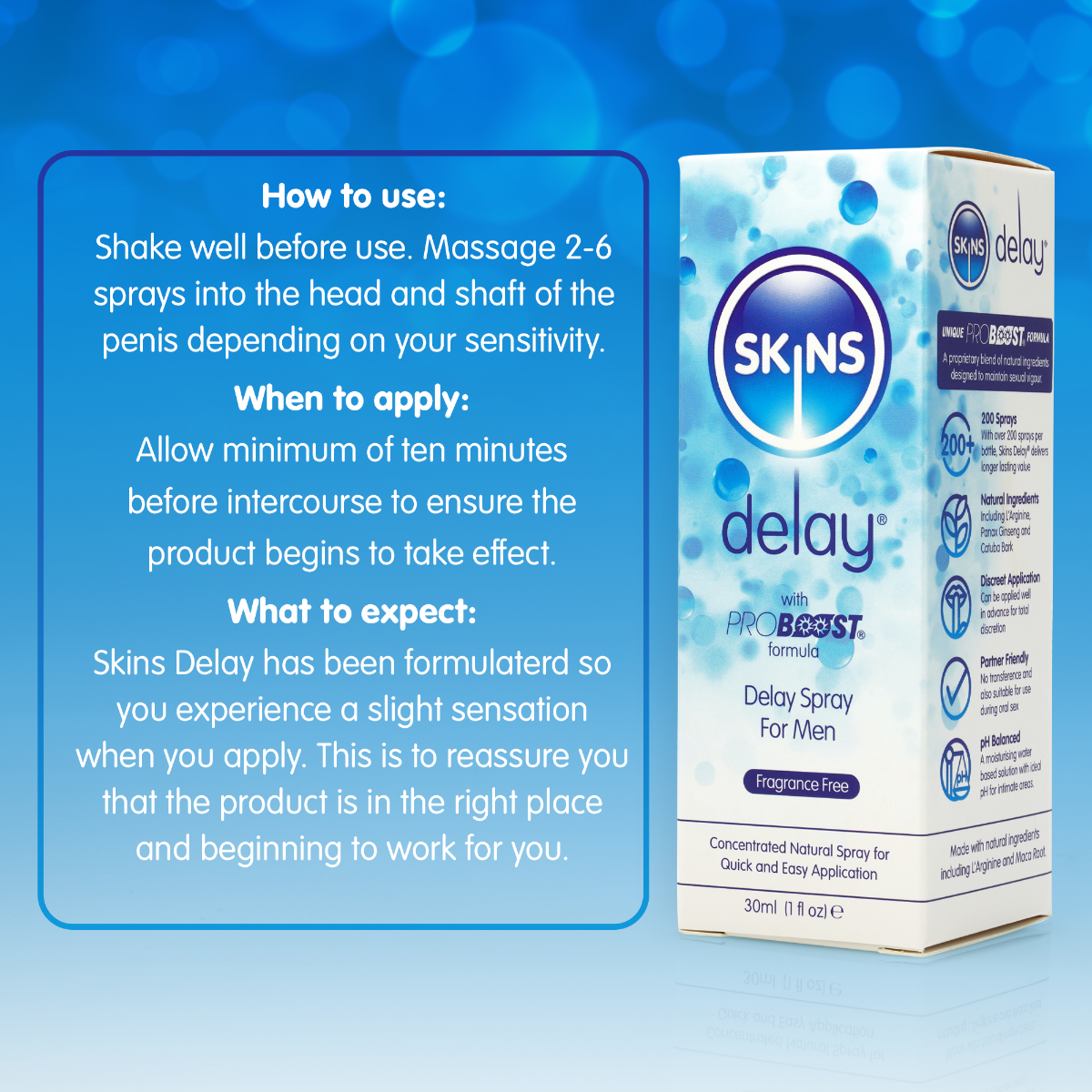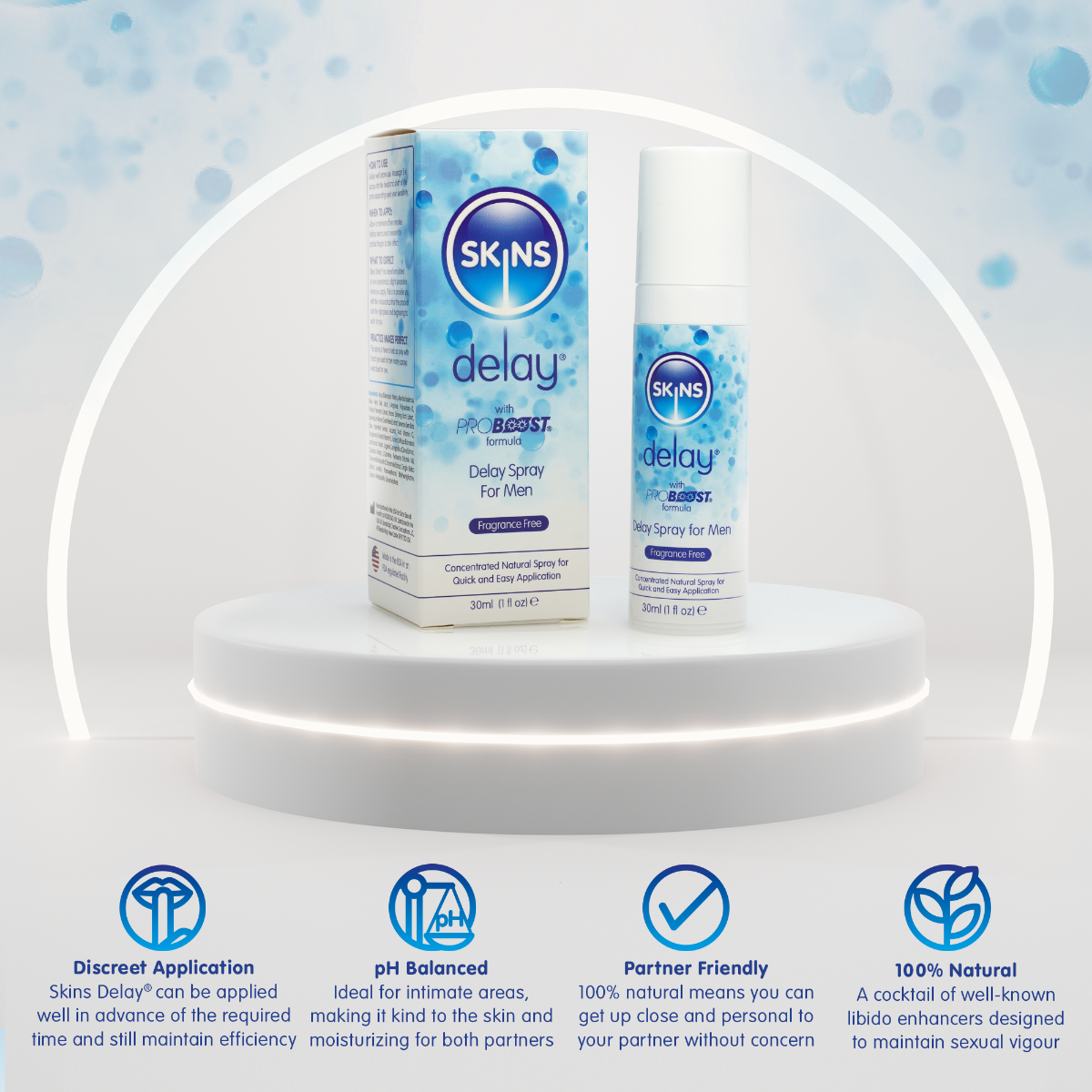 Skins Delay® is an award-winning proprietary blend of all-natural ingredients designed to maintain sexual vigour and improve endurance. Skins Delay® is made from a unique PROBOOST® formula with natural ingredients including L’Arginine Panax Ginseng Gingko Biloba Maca Root Saw Palmetto and Catuaba Bark.