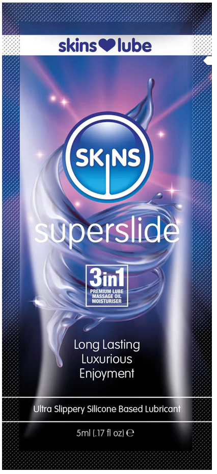 Skins Superslide contains 100% pure grade silicone lubricant making it ultra-long lasting. Silicone will not harm latex and is perfectly safe for internal use as silicone molecules are too big to enter the body through the skin or body linings. Just remember not to use silicone with silicone toys.