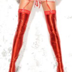 A very striking pair of fiery red sexy stockings that are decorated with a metallic-like lacquer finish. An elastic rubber band features at the top of the stockings with a checked pattern. PLEASE NOTE: these stockings are footless! Also available in Black or White.