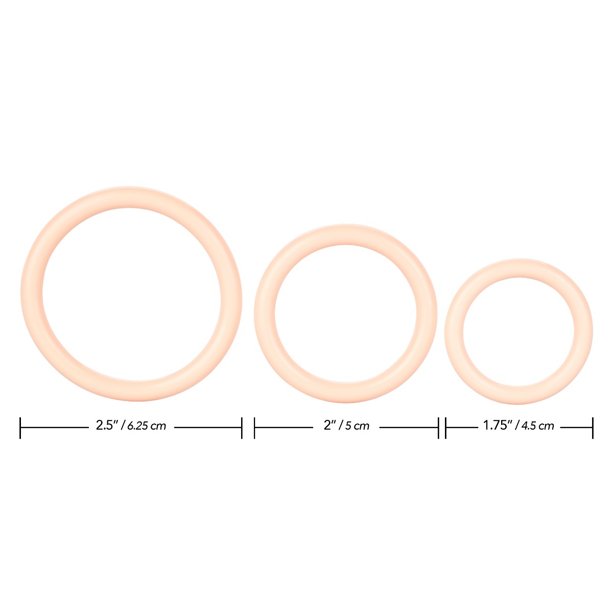 Enjoy triple the erotic sensations and pleasure with the Tri-Rings. The discreet erection enhancers are easy to use and great for instant performance elevation whenever you are in the mood for sensual seduction and endless satisfaction. The rings are supplied in a choice of sizes for maximized and prolonged orgasmic ecstasy.The multi-purpose reusable enhancers comprise of 3 different sizes that are designed to fit comfortably onto the erect penis for stamina support and extended play fun. The sleek rings are made from smooth flexible rubber and measure 1.75”/4 cm 2”/5 cm and a generous 2.5”/6 cm. To use slip the preferred ring size on to the erect penis and slide down to the base. The rubber band provides support for longer lasting intimacy and rock hard erections. For increased pleasurable tingles and sensations it is recommended that you always use a quality lube with this toy.The easy to use enhancers are ideal for the first time and experienced users and perfect for spontaneous unlimited play. The trio of rubber erection enhancer rings are great for self-gratification exploration and for extended couple’s foreplay fun. Use the medium large and extra large rings to enhance stamina and performance for a mind-blowing experience every time. Before and after every use clean the rubber rings with a toy cleaner spray or wash in mild soapy water.