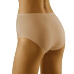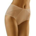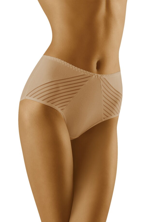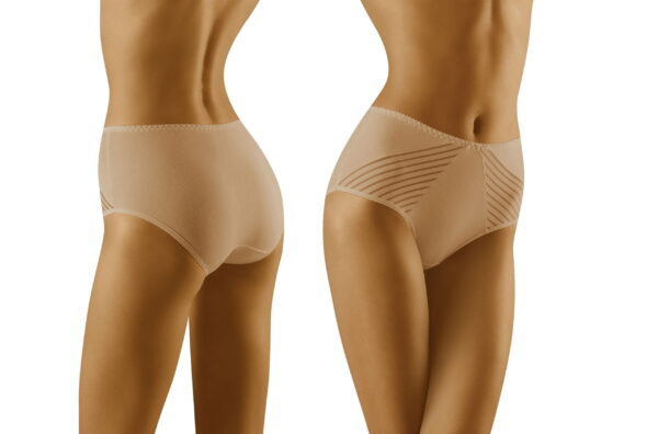 Eco-Ma is a wonderful pair of briefs made from high quality cotton. The front of the brief features two panels at either side with an exceptional stripe design including a mixture of sheer fabric and cotton. This makes the panels semi-transparent which are beautifully finished at the edges. The waistband is elasticated and super stretchy making this brief exceptionally comfortable for women with a large difference in waist circumference. These panels are delicately overlocked at the seams on the inside. Inside is a cotton gusset which is sewn into the brief. The back of the brief is completely plain. Smooth feel. Available in white beige and black and can all be ordered separately on the website. This item arrives packaged in a branded Wolbar box presenting an image of the product.