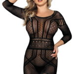A little black bodystocking dress in all over design with sleeves and open back! Item arrives boxed. Please note thong is not included.