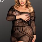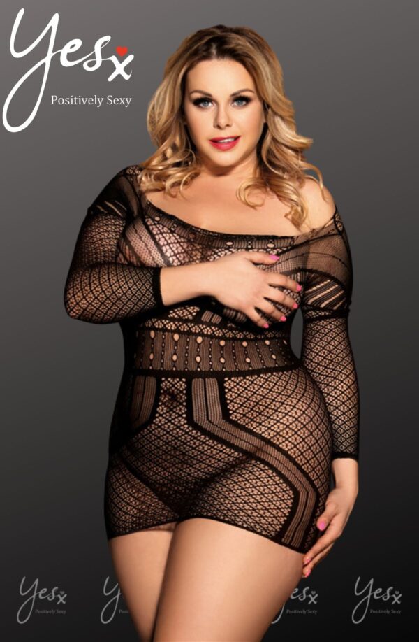 A black bodystocking dress in all over design with sleeves and open back! Item arrives boxed. Please note thong is not included.
