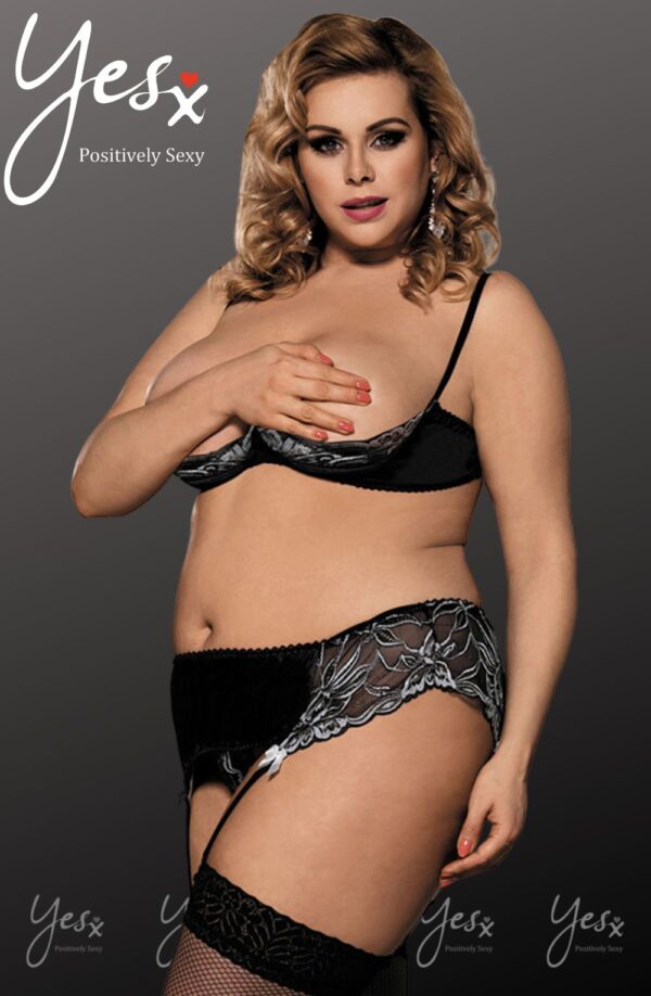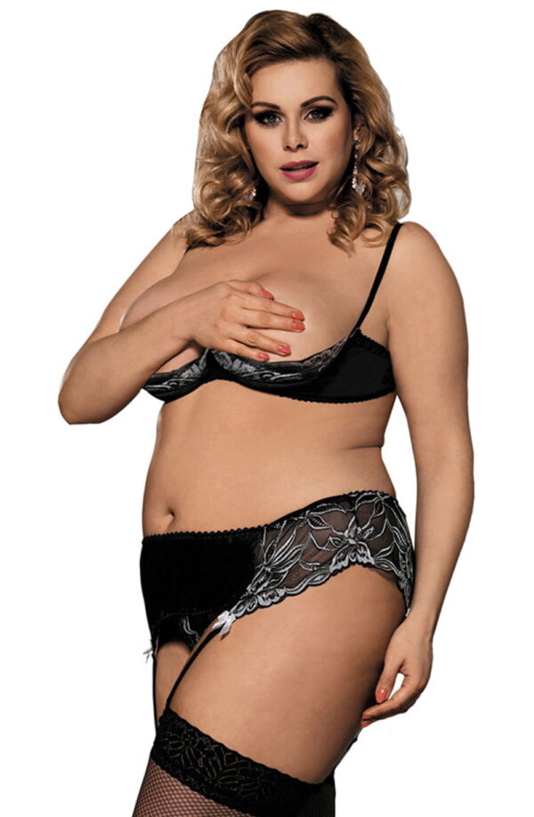 Three piece shelf bra set with thong and matching suspender belt. Lovely embroidery detail in contrasting colour. The bra is underwired and adjustable. Item arrives packaged. Please not the stockings are not included but are available separately.
