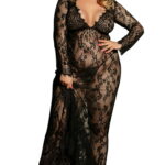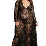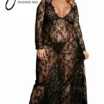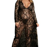 A Stunning long lacey long sleeved nightdress gown in black with floral design.  Beautiful eyelash lace detail on the neckline and cuffs. Matching thong is included.  This item arrives packaged in a Yesx satin bag.