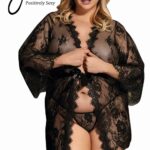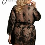 Beautiful dressing gown in transparent lacey fabric. Eyelash lace detail on the edges and satin ribbon tie. Matching thong is included. Item arrives packaged in a Yesx satin bag.