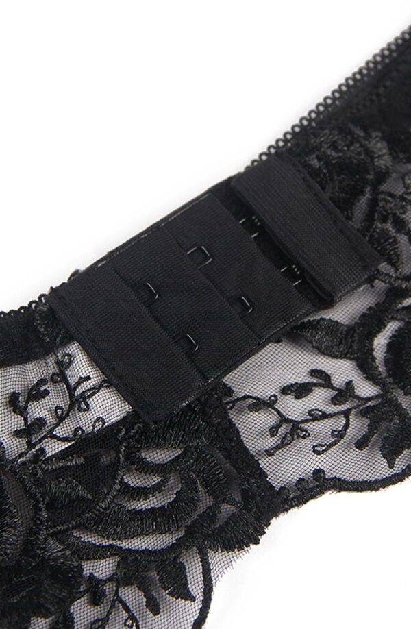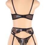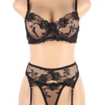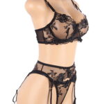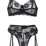 Beautiful lacey black three piece bras set. The bra, suspender belt and suspender straps are adjustable for comfort and fit. Item arrives packaged in a Yesx satin bag.