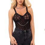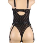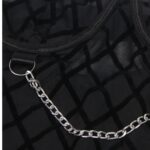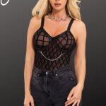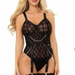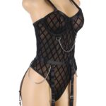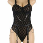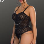 Indulge in bold elegance with our Bodysuit, featuring a captivating fabric design embellished with chains. The intricate pattern adds an alluring touch, while the chains bring an edgy flair. With adjustable garter straps, this bodysuit seamlessly combines sensuality and style. Embrace your confidence and make a striking statement with this unique patterned fabric piece (stocking not included).