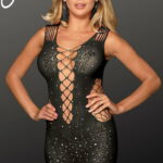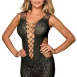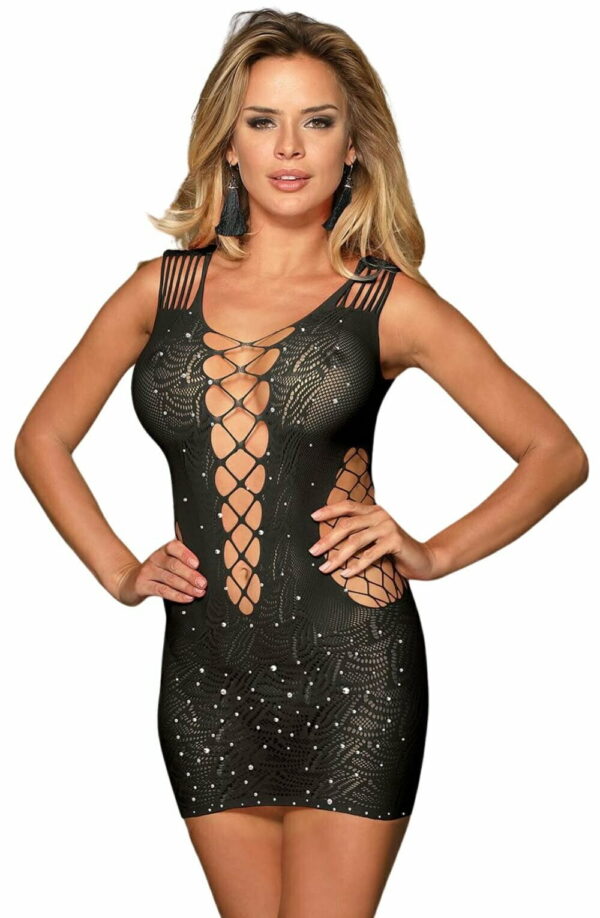 Dazzle in our Black Bodystocking Dress with Sparkling Sequin Detail. The form-fitting design enhances your curves, and the intricate body stocking pattern adds mystery. Sparkling sequin details elevate the glamour, perfect for turning heads at any event. Unleash your confidence with the shimmering sophistication of this dress.