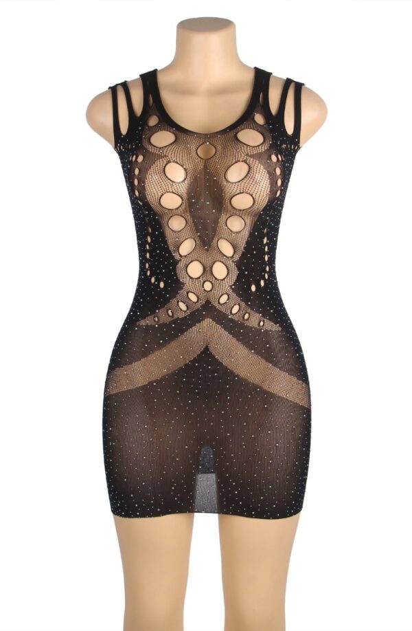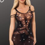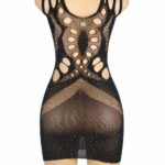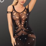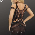 Dazzle in the allure of this Black Bodystocking Dress with shimmering detail. This seductive ensemble combines the sleekness of a body stocking with a touch of glamour. The black fabric contours your curves, while the sparkly shimmering detail adds a mesmerizing and elegant look. Perfect for intimate evenings or special occasions, this dress is a captivating blend of sophistication and sensuality. Make a bold statement and leave a lasting impression with this stunning black bodystocking dress (thong not included)