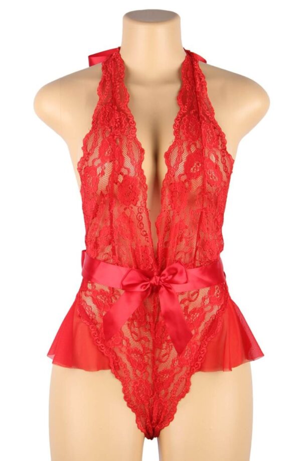 Meet this stunning hot red lacey teddy, the must-have lingerie for a confident women. Crafted from high-quality lace mesh, this breathable and lightweight design features an elegant ruffled hemline, creating a unique and sensual appearance for any occasion. The daring deep V-neckline and playful halter neck straps add sophistication, while the detachable waistband with a butterfly knot provides a trendy touch and flattering silhouette. Distinctive red lace deep V neckline feature Ruffle mesh & lace design to compliment your silhouette Detachable waist belt Packaged in a lovely YesX satin bag