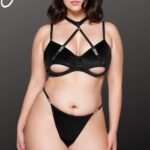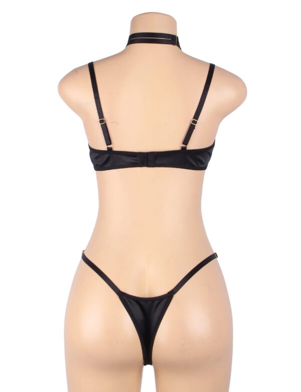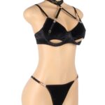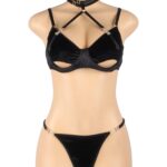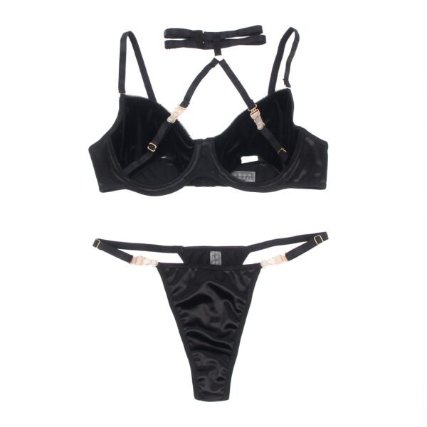A gorgeous black halter bra set, designed to celebrate every curve and crafted with a velvety feel that’s irresistible to the touch! Featuring a bold, hollow-cut bra with supportive underwire and a seductive halter neckline, this set brings confidence and style together effortlessly. The ultra-soft, velvety fabric feels amazing against the skin, while gold hardware adds a touch of glamour. Paired with a high-cut thong that accentuates your curves, this set is perfect for making a statement. Embrace your inner vixen and revel in the plush allure of this stunning lingerie set!