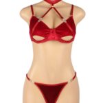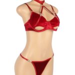 Turn up the heat with this luxurious red halter bra set, designed to celebrate every curve and crafted with a velvety feel that’s irresistible to the touch! Featuring a bold, hollow-cut bra with supportive underwire and a seductive halter neckline, this set brings confidence and style together effortlessly. The ultra-soft, velvety fabric feels amazing against the skin, while gold hardware adds a touch of glamour. Paired with a high-cut thong that accentuates your curves, this set is perfect for making a statement. Embrace your inner vixen and revel in the plush allure of this stunning lingerie set!