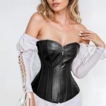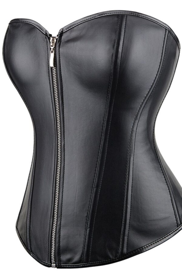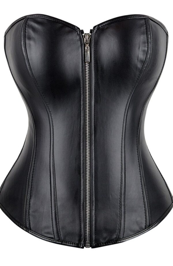 Black Leather-Look Zip-Up Corset with Adjustable Lace-Up Back Make a bold statement with this sleek black leather-look corset, designed to sculpt and flatter your figure with edgy sophistication. Featuring a smooth faux leather finish, a secure front zip closure, and an adjustable lace-up back, this corset offers both fashion and function in one stunning piece. Perfect for gothic styling, clubwear, cosplay, or lingerie looks, this versatile corset elevates any outfit with fierce confidence and a flattering silhouette. Key Features:• Sleek black leather-look finish for a bold, edgy vibe• Front zip-up closure for easy wear and secure fit• Adjustable lace-up back for custom shaping• Supportive boning to enhance your silhouette• Versatile styling – ideal for alternative fashion, burlesque, or night out Pair with jeans, skirts, or layered over a dress for a powerful, fashion-forward look. (Please note: corset only.)