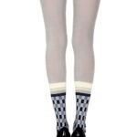 Opaque light grey 100 denier reeve tights with colorful socks print on the lower legs. The print is on both legs front and back.