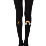 Opaque black 120 denier tights with a colorful rainbow and sun print . Each print is on one leg and can be worn either at the front or at the back part of the legs.