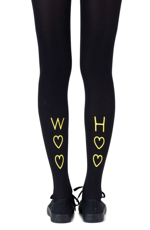 Express your excitement and decide where the party will be with these insanely cute reversible tights. Colour: Black tights with Yellow print. Thickness: 120 denier. Unless they have X-ray vision no one will be able to see through these opaque tights. Is the party in the front or the back? You choose with reversible tights where to place all the fun. Hand print no two are the same.